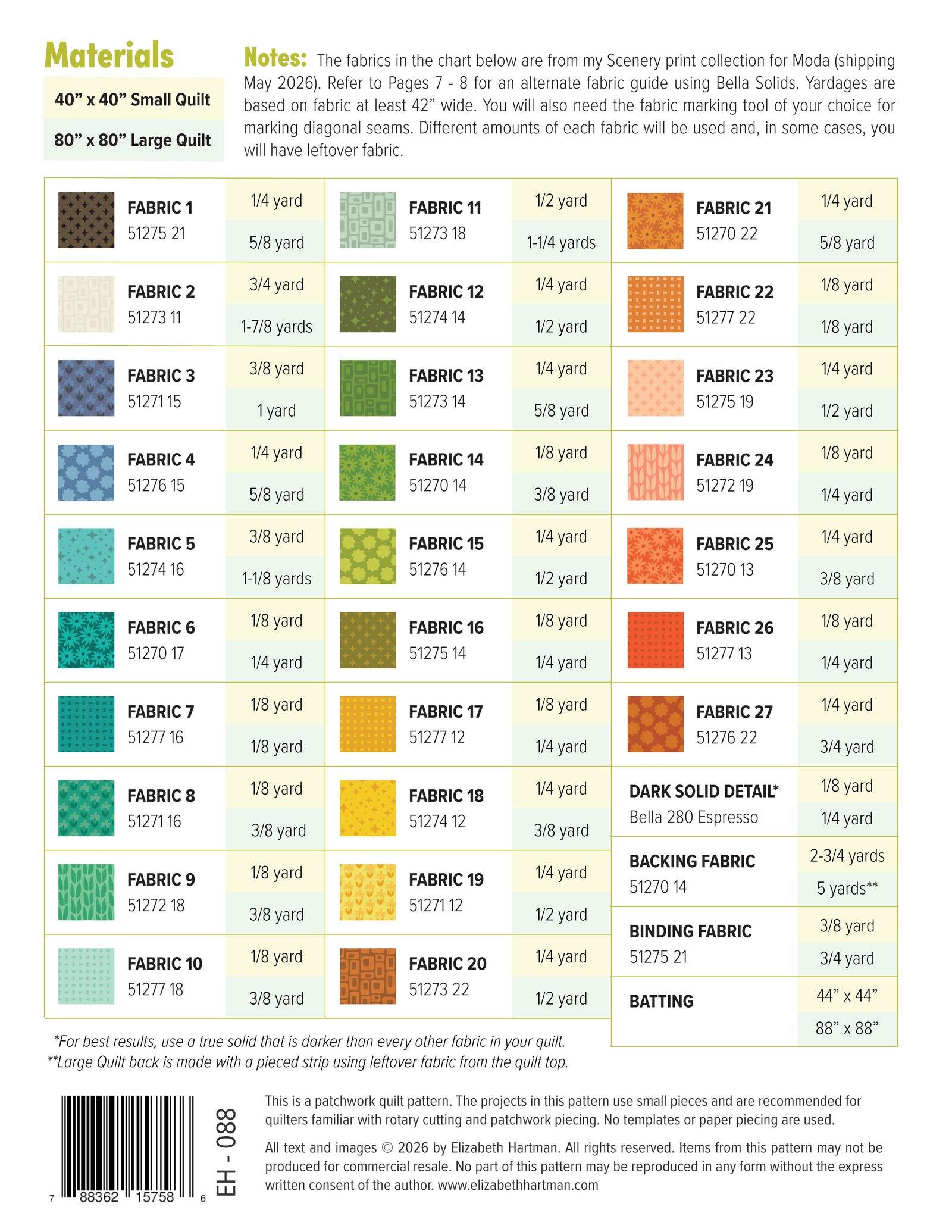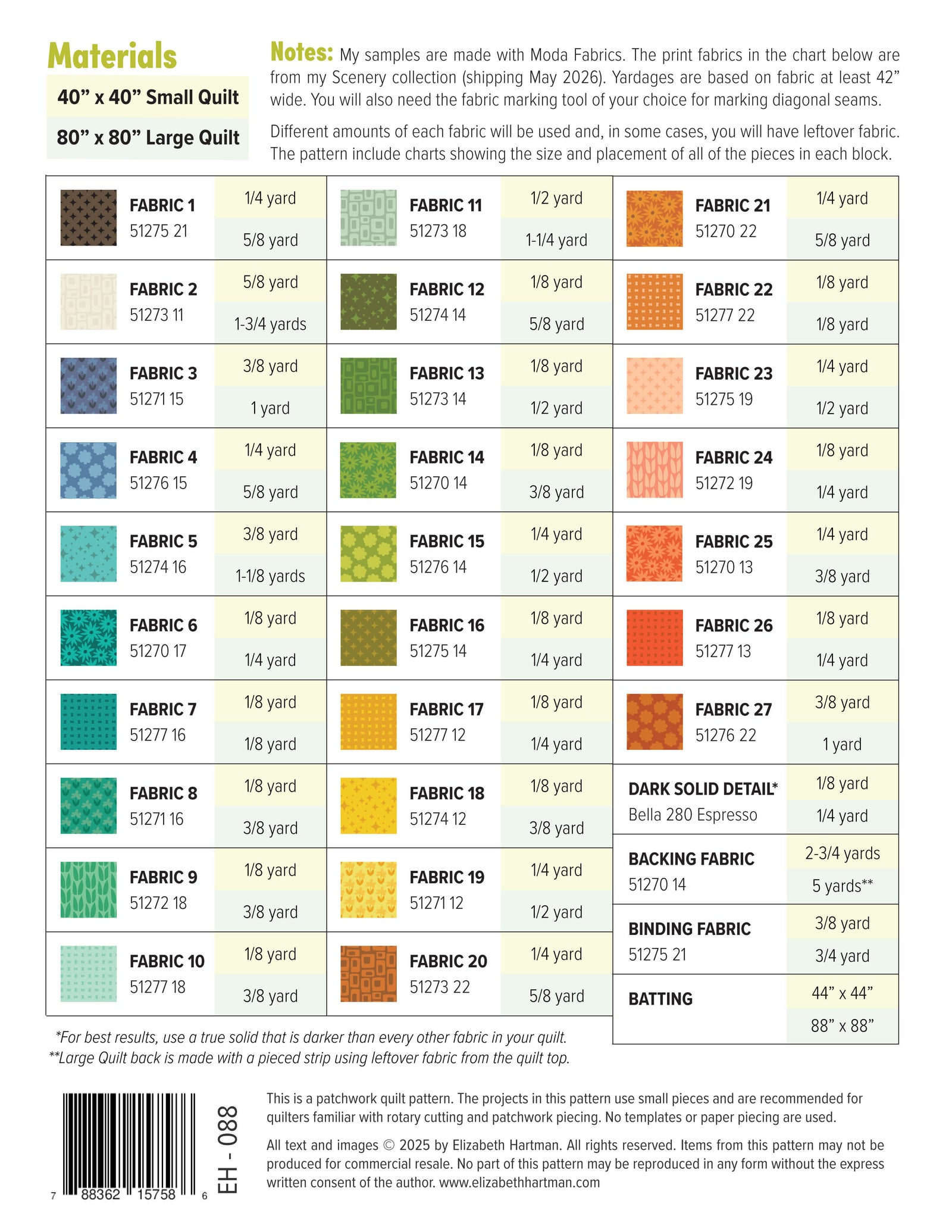 Outdoors is made with my Scenery collection for Moda Fabrics. Your favorite store can order the fabrics now for shipping May 2026. Refer to the pattern back image for yardage information.
