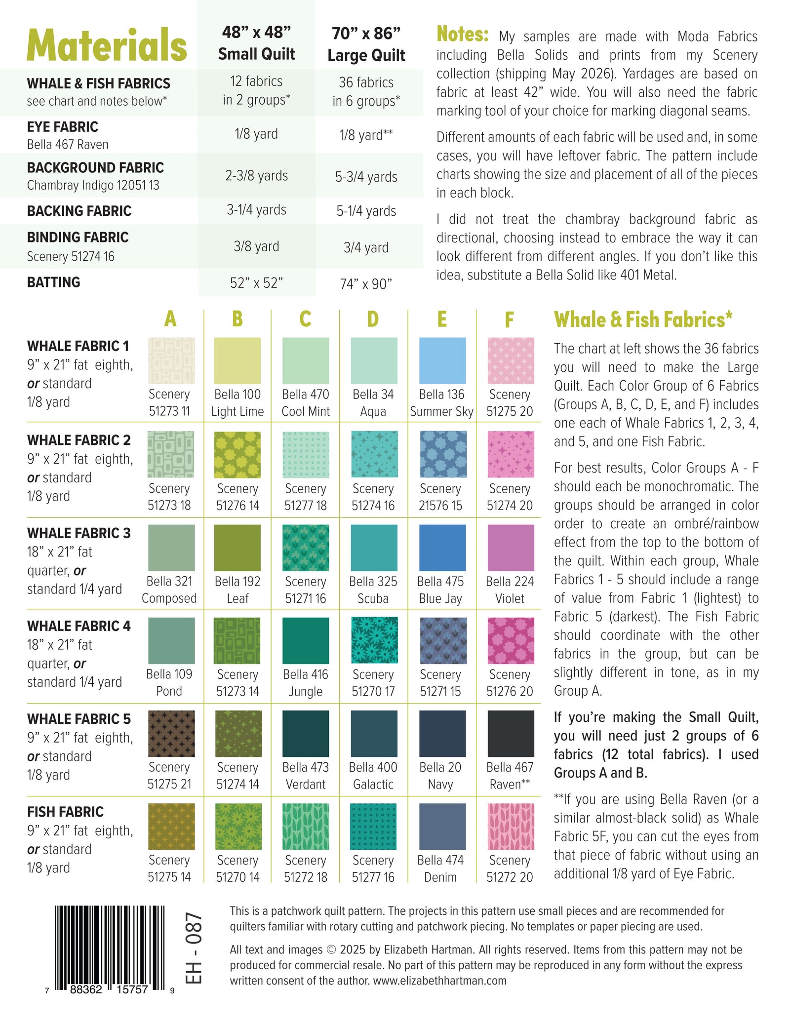 Whale Watching is made with my Scenery collection for Moda Fabrics and Bella Solids. Your favorite store can order the fabrics now for shipping May 2026. Refer to the pattern back image for yardage information.