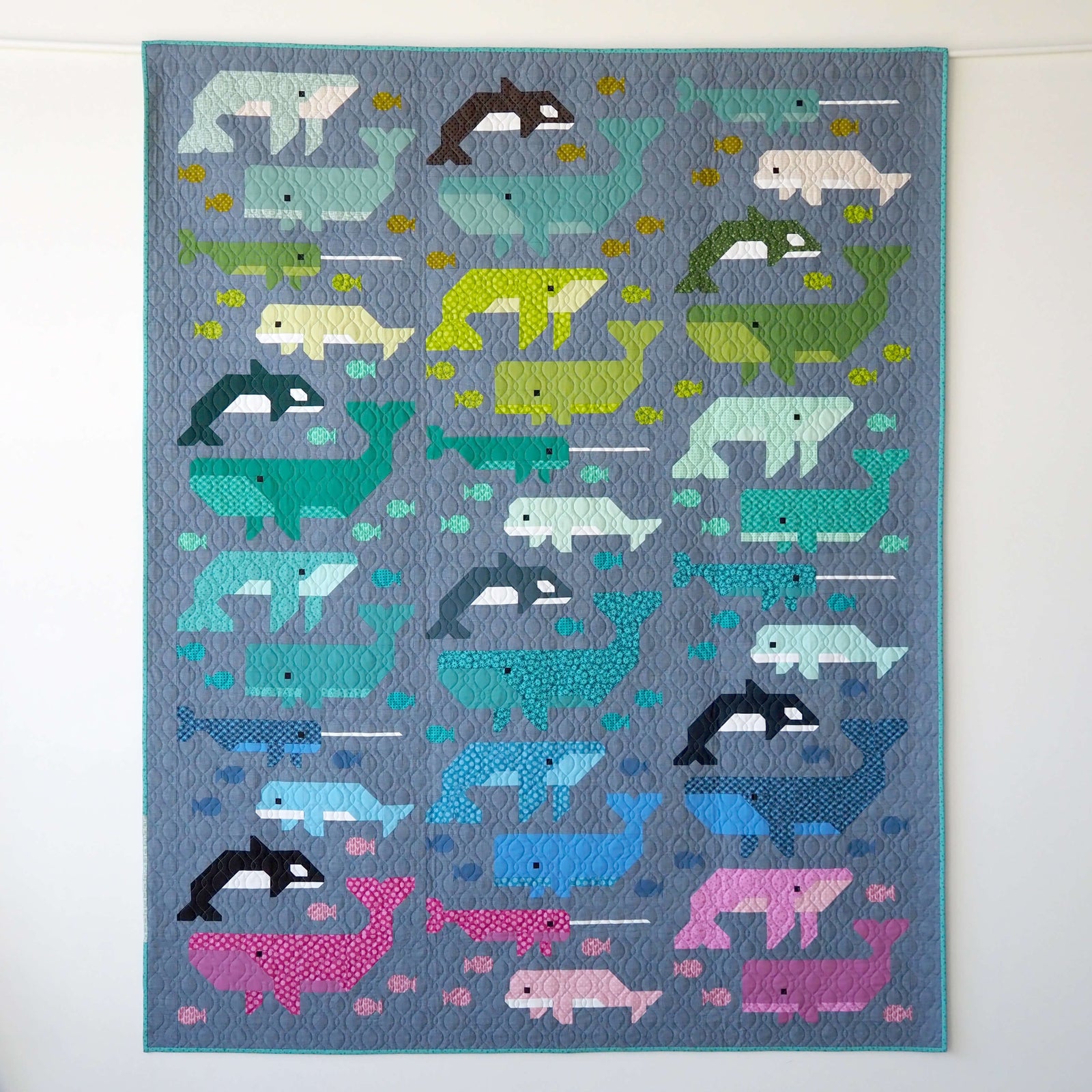 These sweet cetaceans and their fishy friends are ready to piece using a combination of fat eighths, fat quarters, and conventional patchwork techniques.