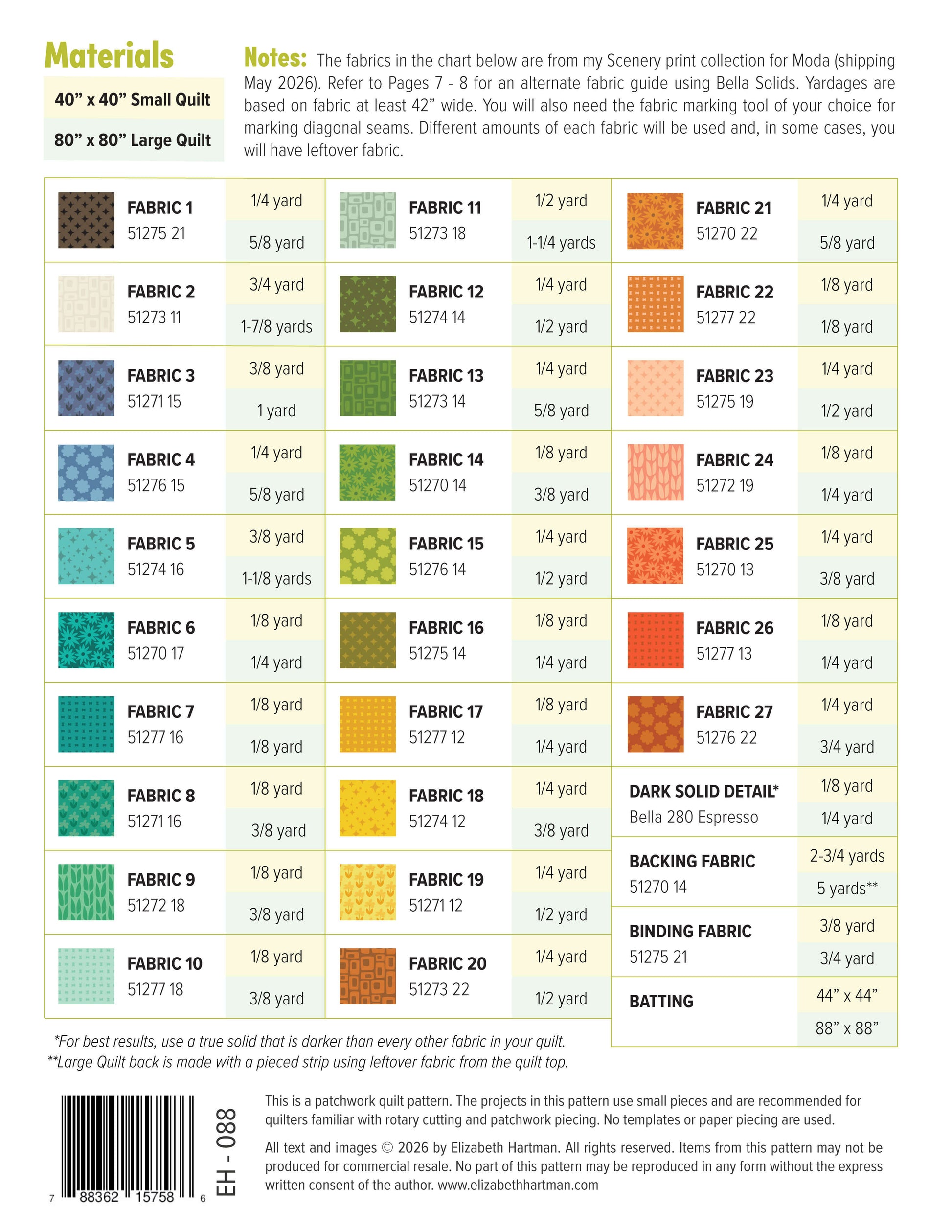 Outdoors pattern and quilt design ©2025 by Elizabeth Hartman. This pattern may not be used to make items for sale in any quantity or venue. No part of this pattern may be reproduced or distributed without the express written consent of the author.